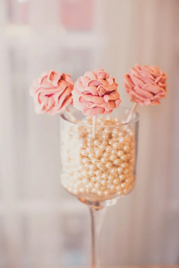 Bakers can truly create works of art with cake pops. Using buttercream frosting, these cake pops resemble roses displayed in a pearl-filled glass. This would look divine on any dessert table.