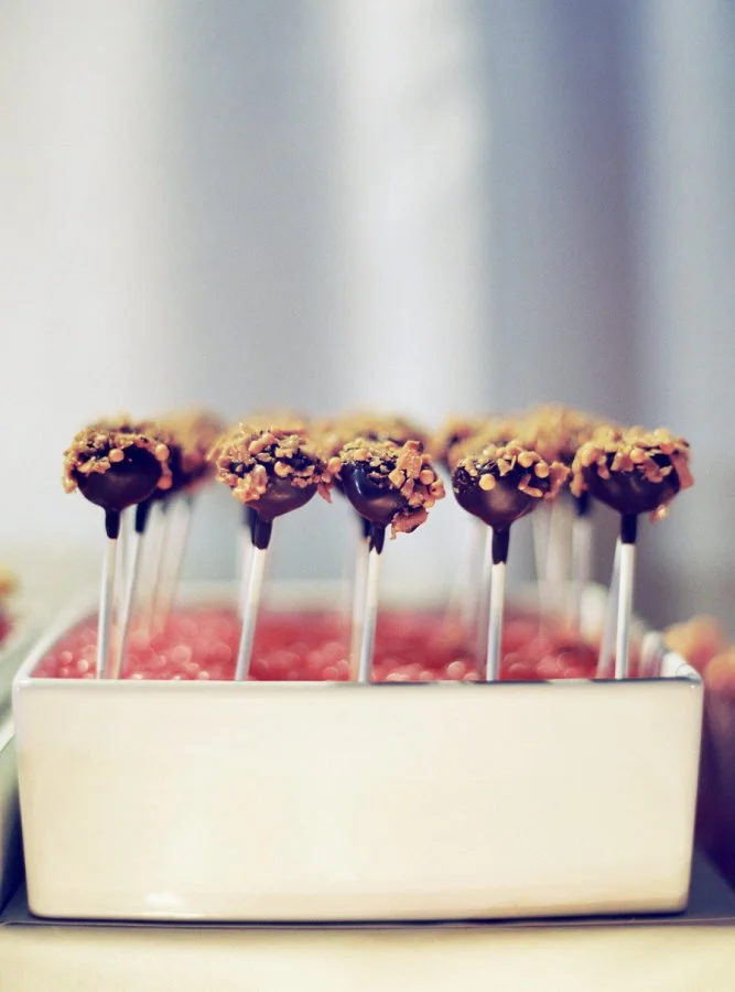 By using creative flavors, one can also have creative cake pops. These studded chocolate-covered cake pops feature chopped nuts to give them a little crunch and dynamic flavor. Other great ideas include crushed graham crackers for s’more-flavored pops, pop rocks for an unexpected surprise, and sprinkles in your wedding colors.