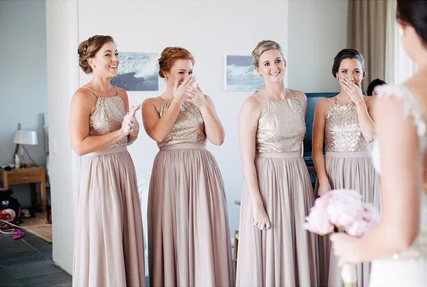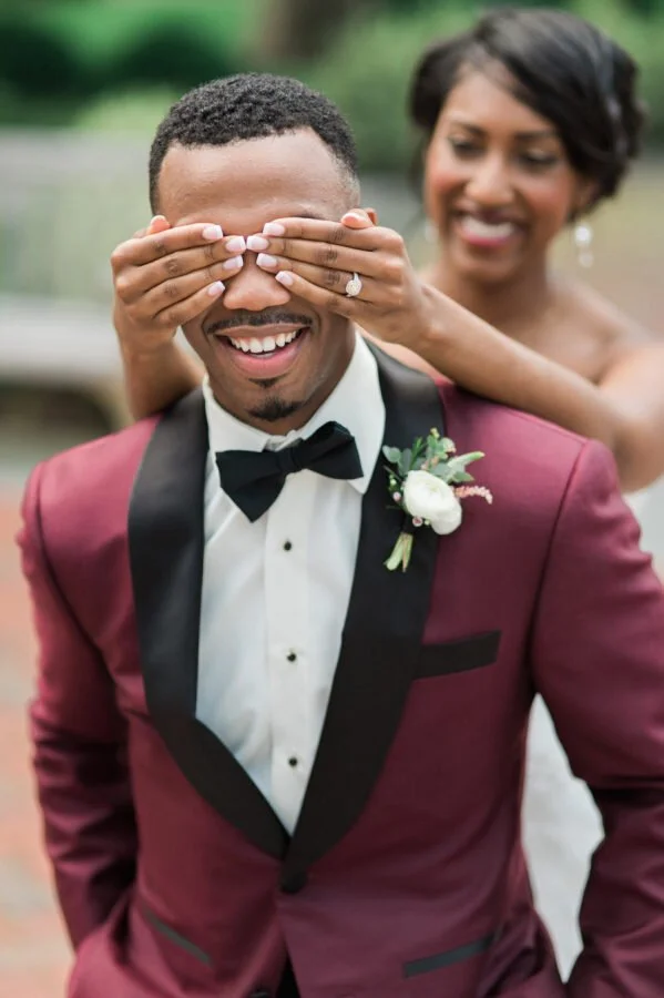 There are a lot of fun options on how to do this. Some brides walk up to their soon-to-be husbands and tap them on the shoulder to turn around. Others stand back-to-back with their groom and turn around at the same time. And some plan over-the-top reveals such as coming down a grand staircase, stepping out of an elevator and even, letting go of a collection of balloons.