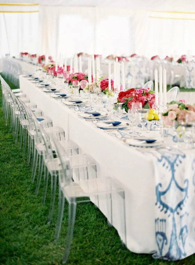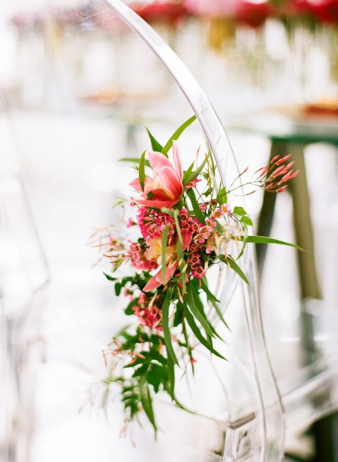 One of the hottest trends for weddings is ghost wedding chairs – clear chairs with a modern flair. And since chairs are a must, these additions are a unique way to add a twist to your wedding style. And there are many ways to add your own touch and personalization, too! Placed next to a long family-style table, these clear chairs echo the glassware. They almost disappear next to the white linens, creating the feeling of more room in the reception hall.