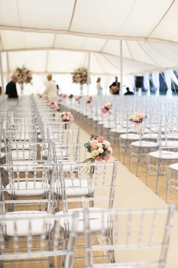 Ghost chairs are great for ceremonies, too. Clean rows of clear chairs make quite the impact and allow for the elaborate design of the venue's floor shine through.