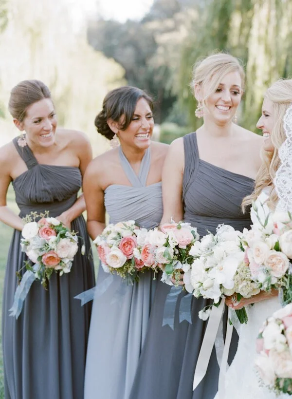 Gray Bridesmaid Dress Ideas. Gray is one of the “it” colors for weddings this year. Not only can anyone pull it off but it can complement just about any type of wedding. If you are looking for a chic color for a bridesmaid’s dress that doesn’t overpower the event, gray is a great choice. Sticking with neutral and natural colors, this bride’s best girls are in long gray dresses in various styles. The length and fabric are the same but the necklines are different and equally attractive to each lady.