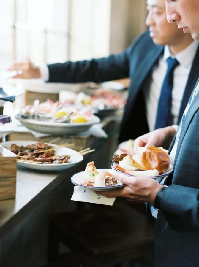 First, what’s the difference? Plated dinners are where guests are served at their seats. Couples can do this a couple of ways. Either guests can select their entrée ahead of time – say through their RSVP – or they can be served a duet meal, which consists of two half portions of meat/seafood/pasta. A buffet style dinner is where guests walk alongside long tables, select from a variety of options presented in chafing dishes or on platters and take their plates back to their seats. Staff are on-hand to help serve and replenish, as needed.